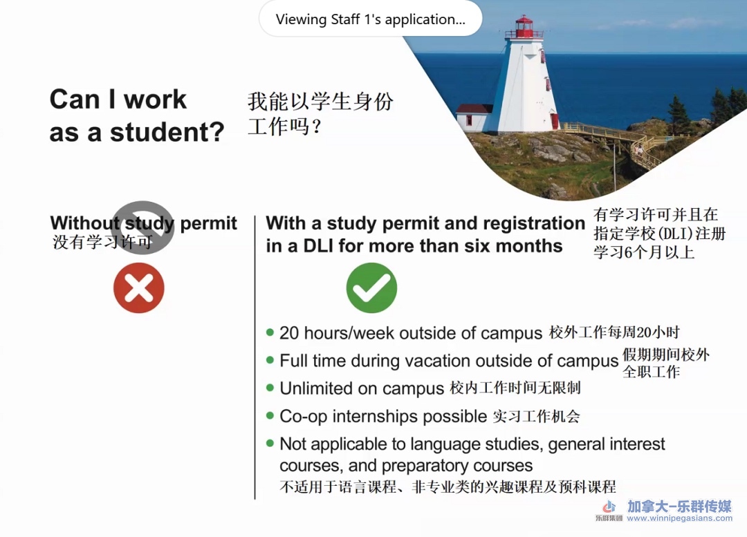 加拿大允许持有学签的学生打工,有几点要求:$ A# {+ ?* }3 c) s2 ]: H